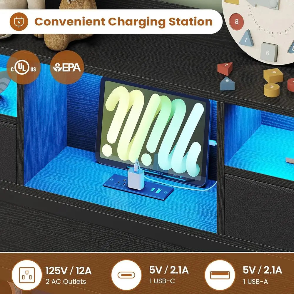 This modern twin-sized bed features a high headboard with integrated storage solutions, including five shelves and two fabric drawers, perfect for keeping your essentials and decor organized. The bed's design is not only stylish but also functional, with a built-in charging station that includes two AC outlets, one Type-C port, and one USB port, conveniently located for powering your devices while you rest.