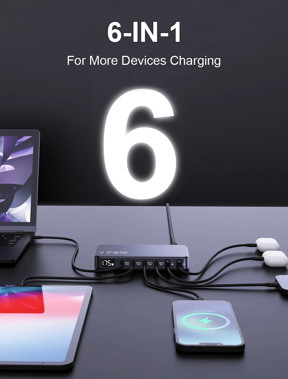 Ueetop 175W GaN USB C Charger LED Display 6-Port Desktop Charger Type C PD 100W PPS 45W Fast Charging for MacBook Samsung iPhone