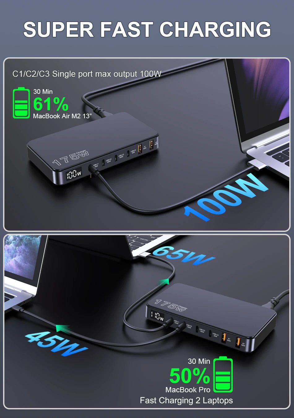 Our 175W charger is equipped with 6 ports (4 USB-C + 2 USB-A ports), of which the USB-C1/C2/C3 ports support a maximum of 100W output, the C4 port supports a maximum of 20W output, and the 2 USB-A ports support a maximum of 60W output, so it can satisfy the fast charging needs of your multiple devices.