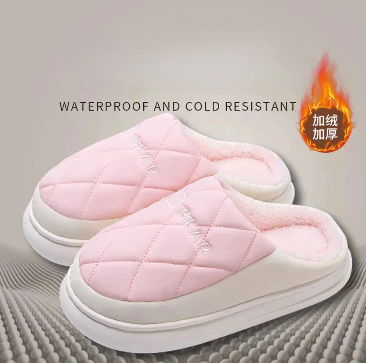 This winter indoor slipper combines a cotton upper with a soft flannel lining and a plush insole to provide warmth during cold weather. The exterior is waterproof for protection against indoor spills or damp floors. The EVA outsole features a non-slip surface for stable footing on smooth indoor floors. A mid-range heel height, approximately 3 cm to 5 cm, adds a subtle elevation without bulk.