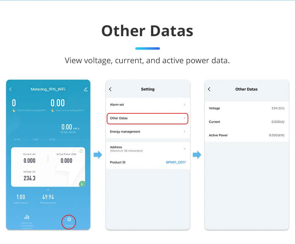 - Measured key data: Voltage, Current, Power, Power factor, Temperature